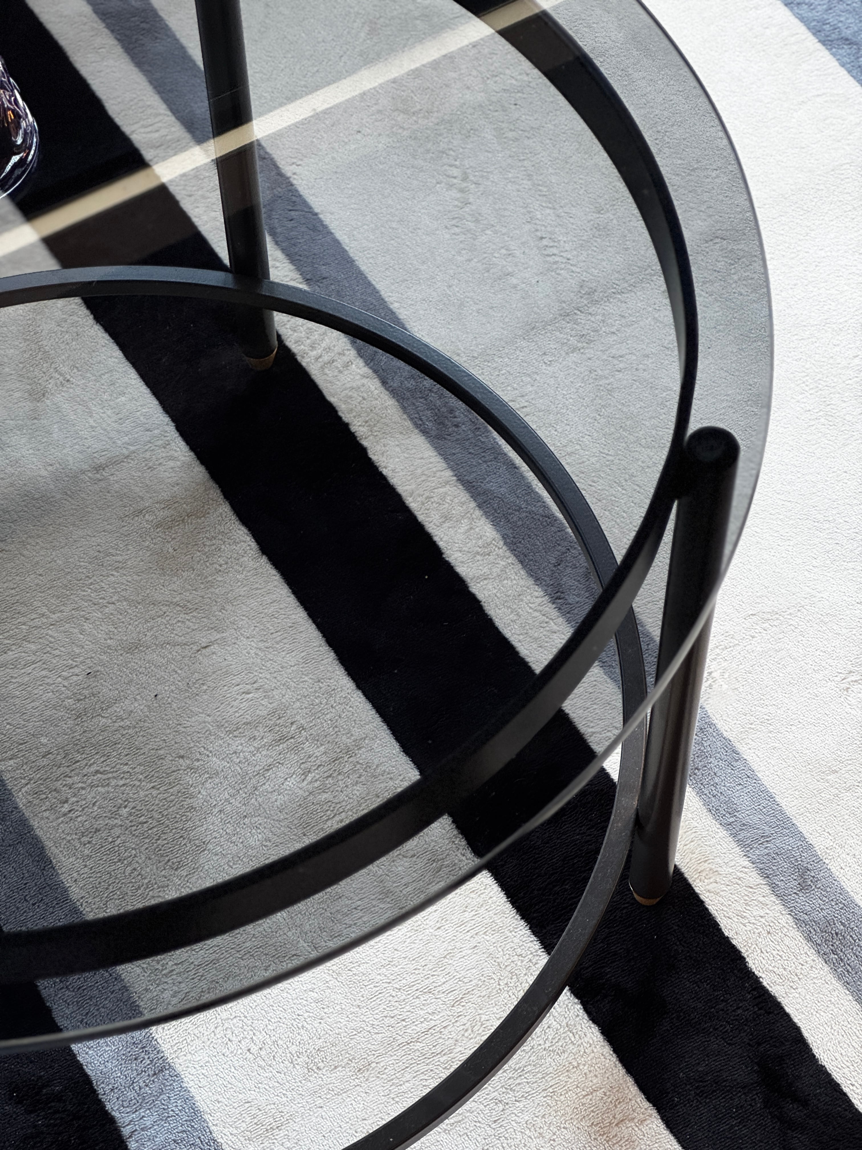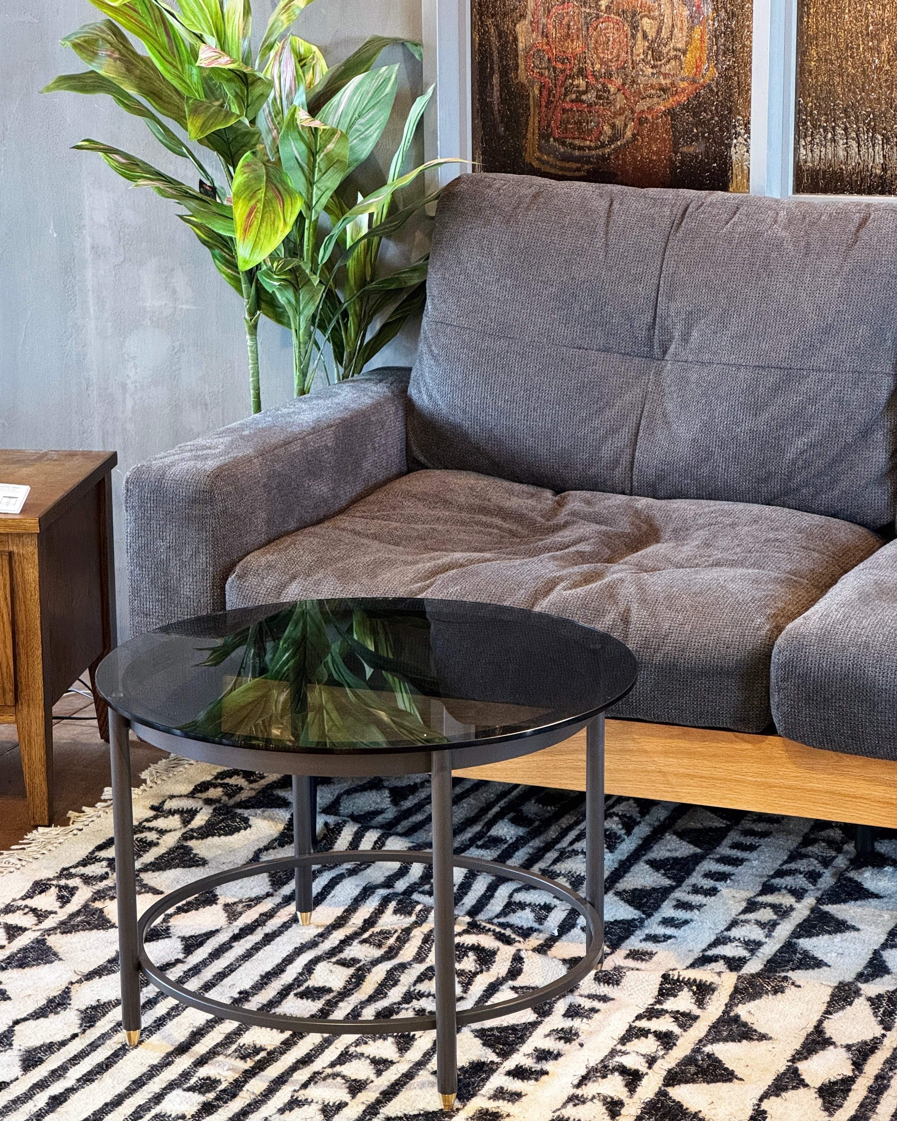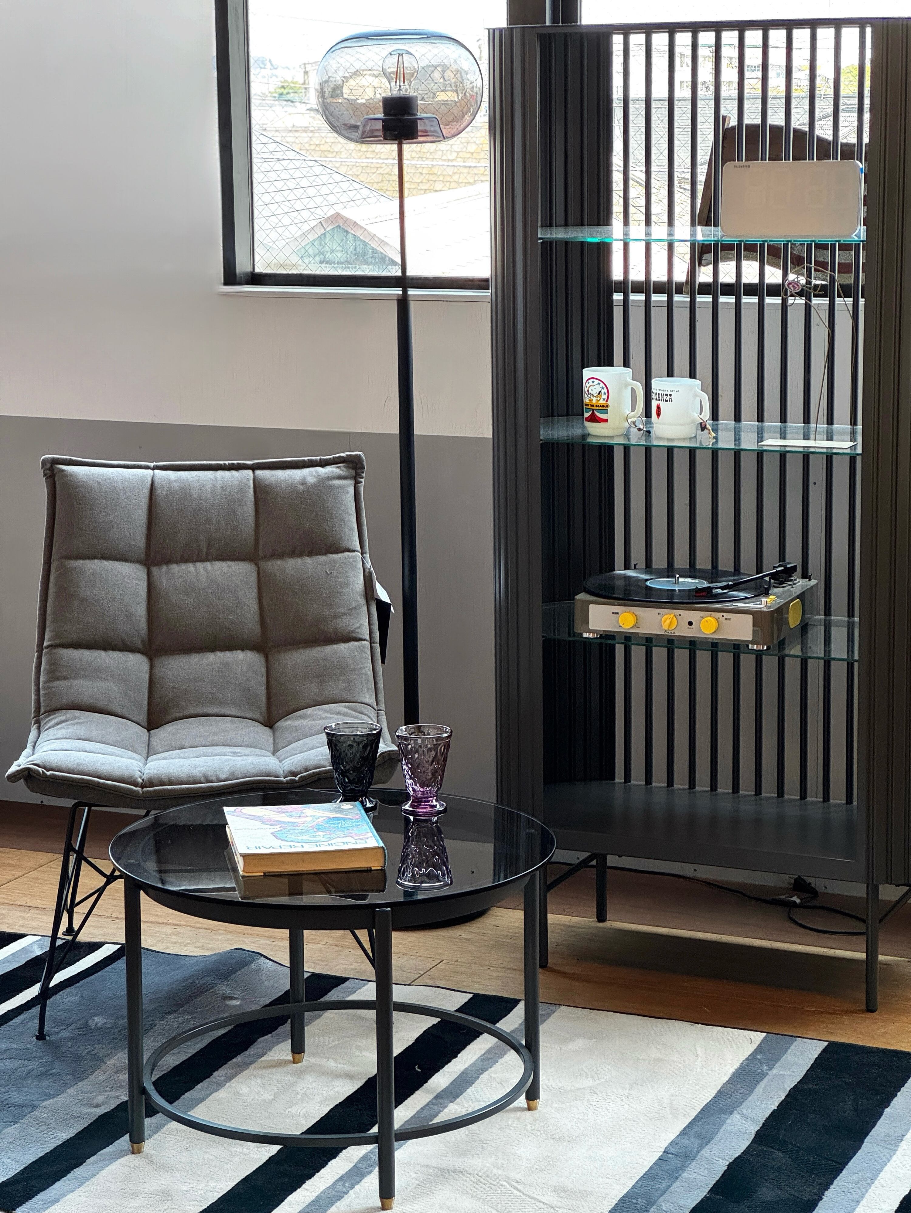 ガラスのスモーク色が光を柔らかく反射し、部屋全体に落ち着いた雰囲気をもたらします。