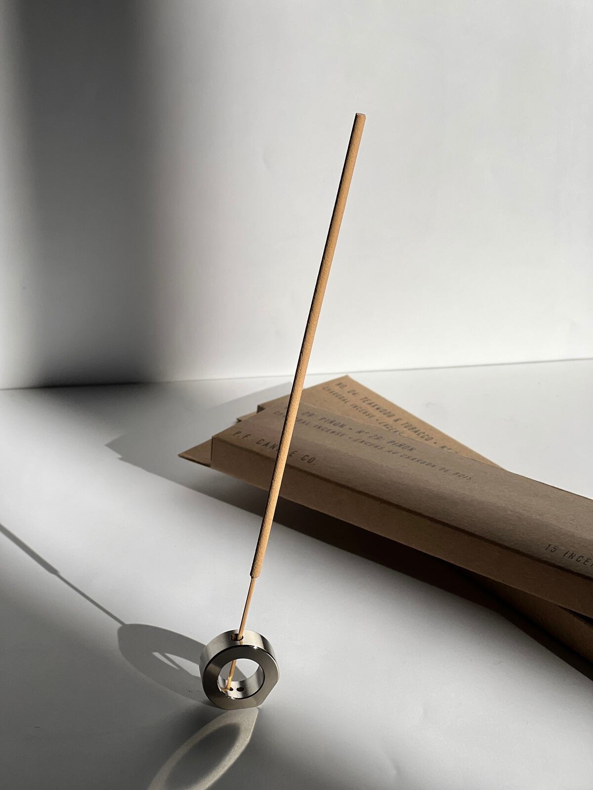 インセンススタンドと言うよりも、インセンスを立てるだけの器具として制作していますので、ビンテージの器、北欧の皿、マグカップ、空瓶など好きな器を受け皿にしてお楽しみください。