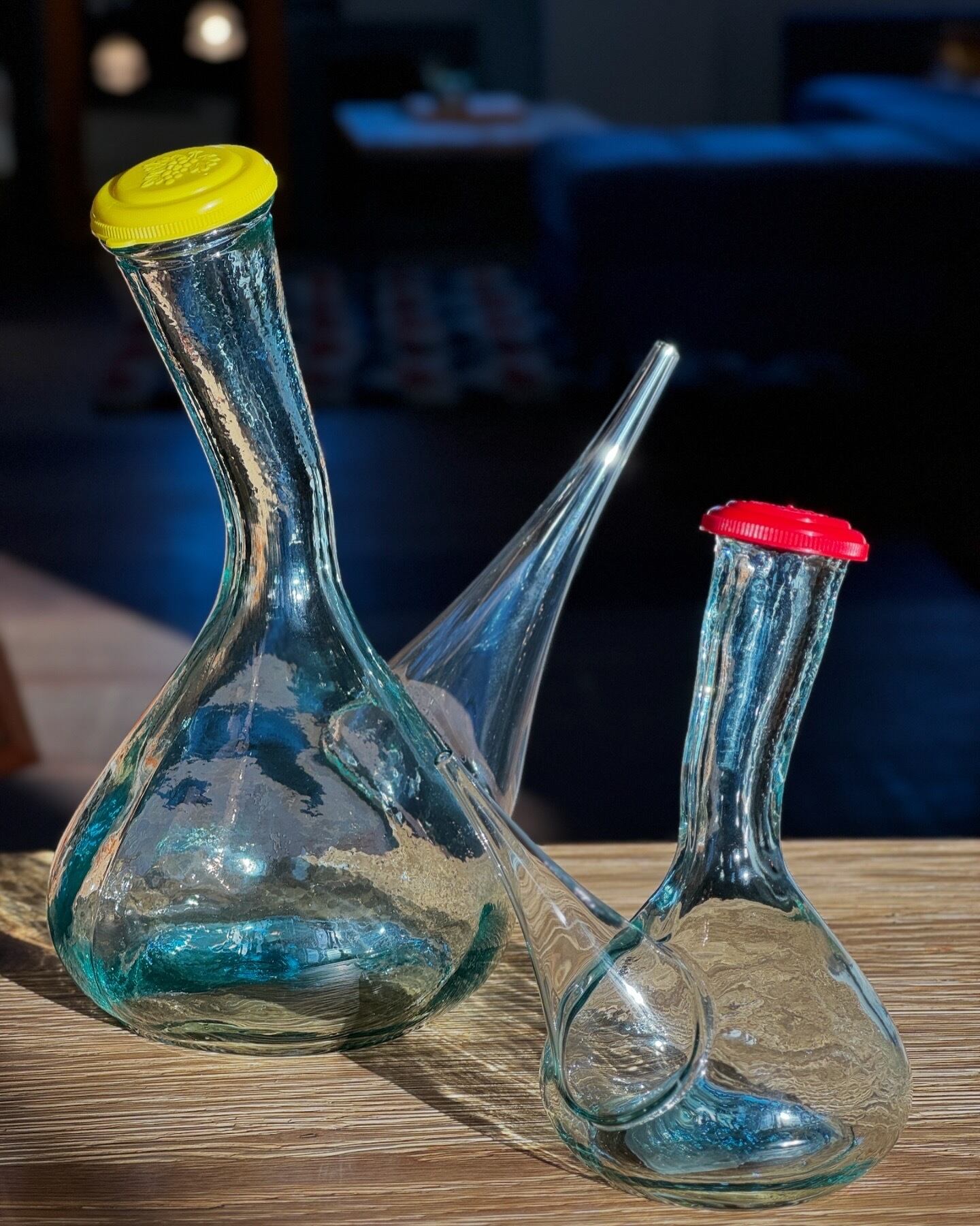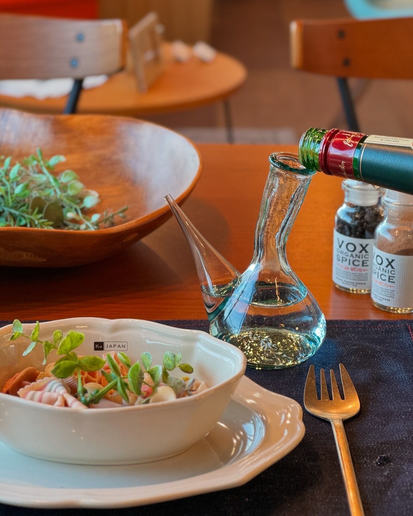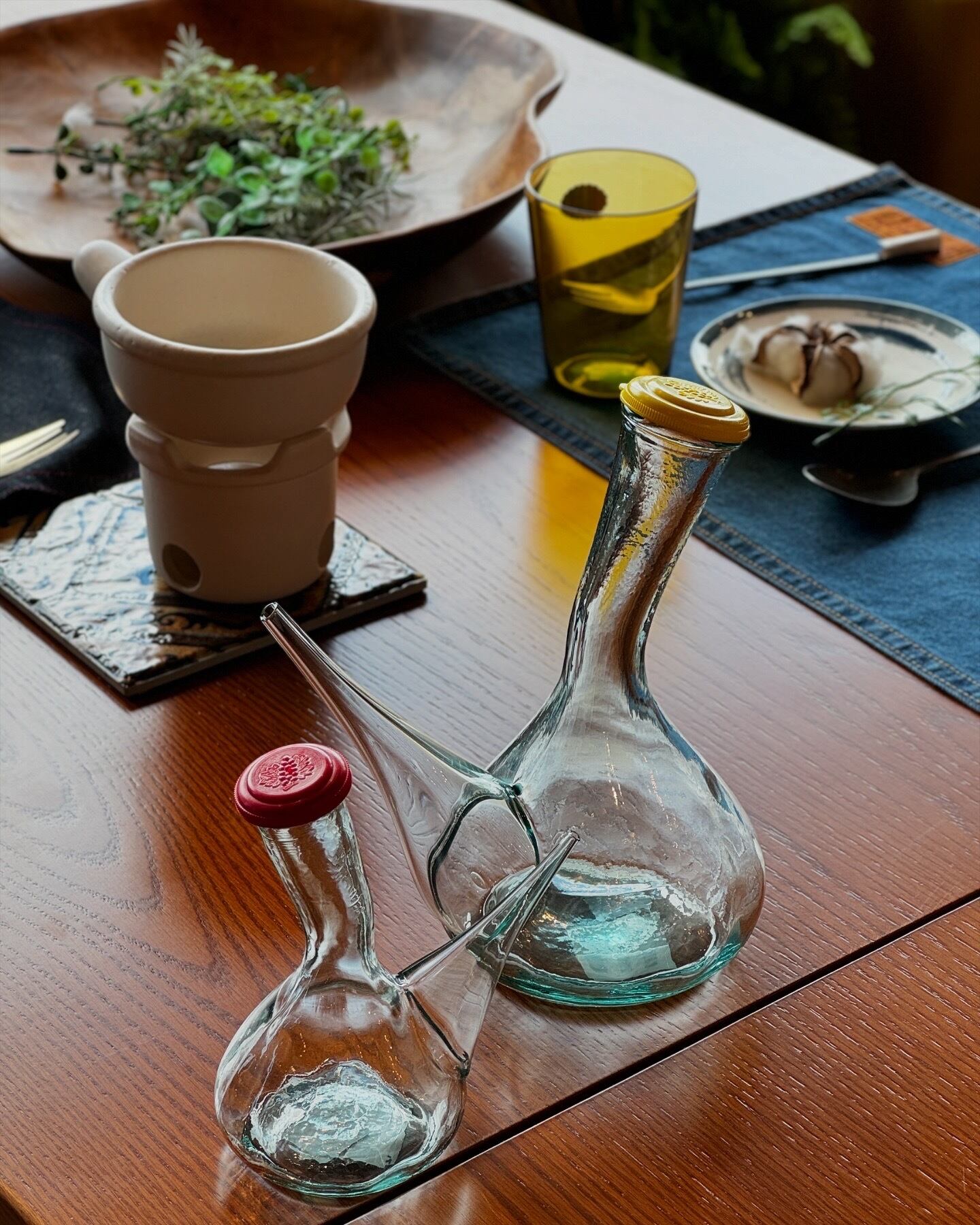 リサイクルガラスの風合いが美しく、お水やオイルのデキャンタとしてもおすすめです。