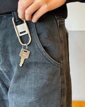 スプリング式で脱着しやすく、開閉式のセンターパーツがストッパーになっているのでベルトループに付けた際にキーリングと鍵の回転を防ぎます。